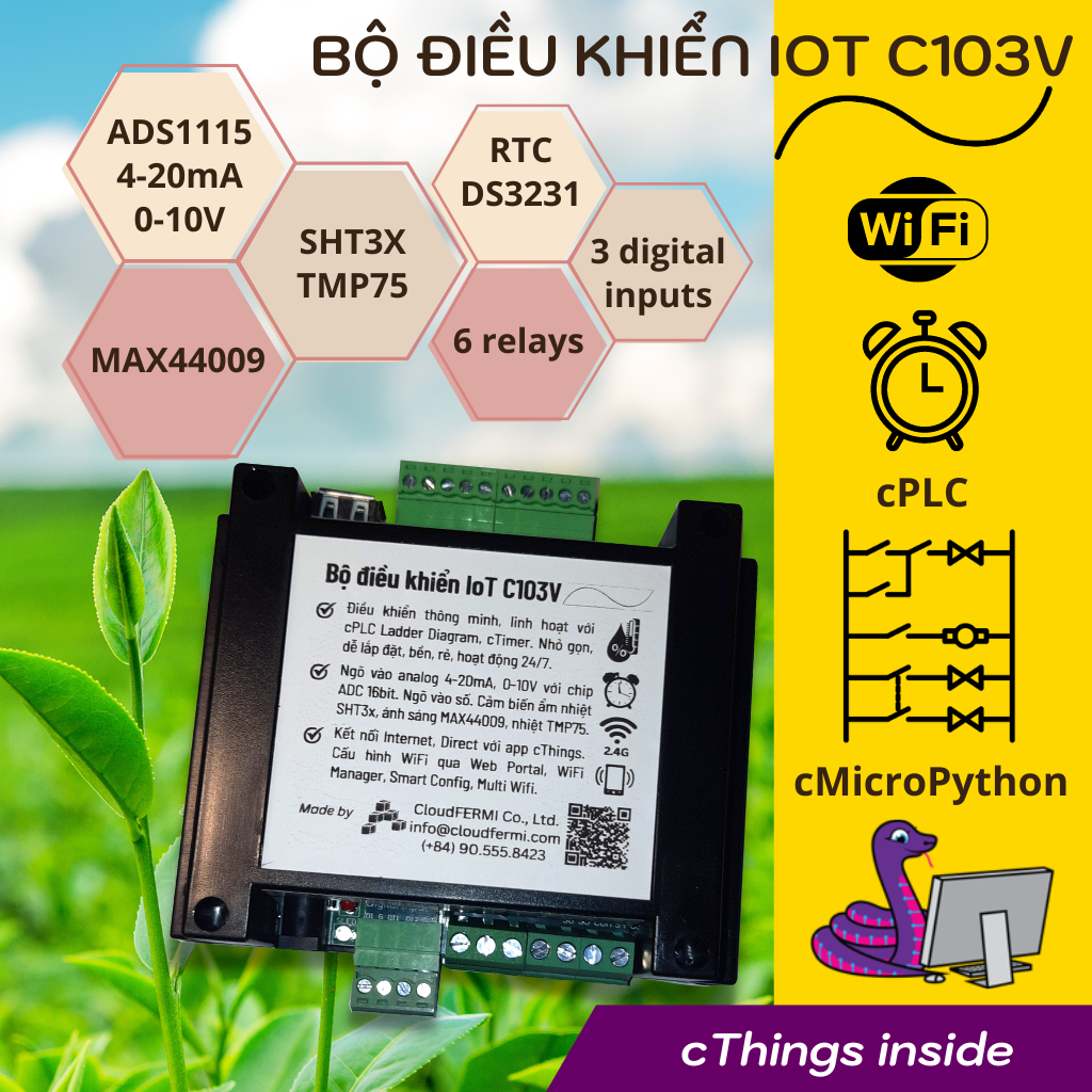 Chào mừng bạn đến với dòng thiết bị C103V tích hợp analog ADS1115 16-bit, Lora SX1278 ổn định, bền, giá rẻ, dịch vụ hỗ trợ 24/7, sản xuất bởi công ty CloudFERMI, với nhiều tính năng độc đáo.